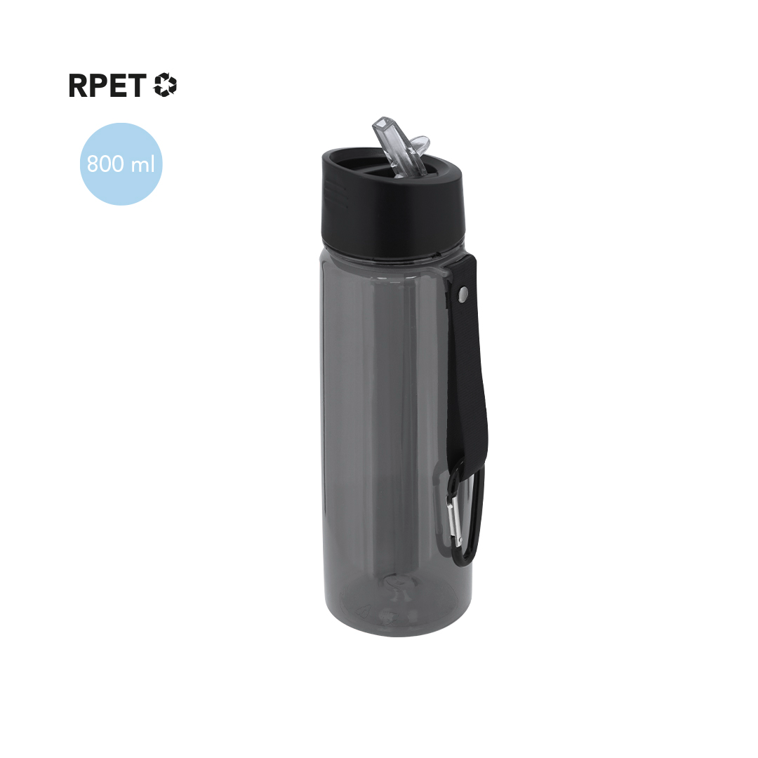 Bidón de 800 ml fabricado en resistente RPET y cuerpo de acabado transparente en variada gama de colores. Tapón negro de rosca, con dosificador y dosificador plegable