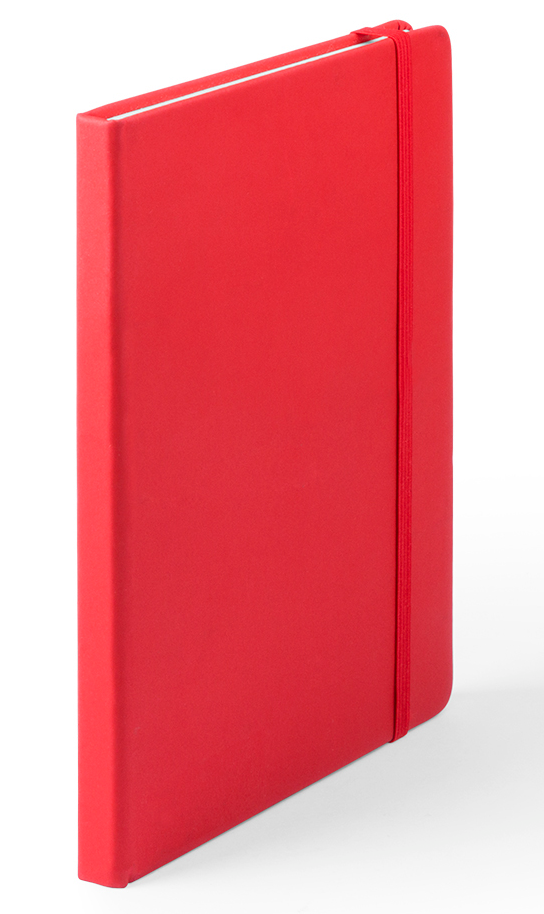 Bloc de notas A5 con tapas duras fabricado en suave polipiel y con 100 hojas de disposición a una raya. Incluye marcapáginas de tela y banda elástica a juego.