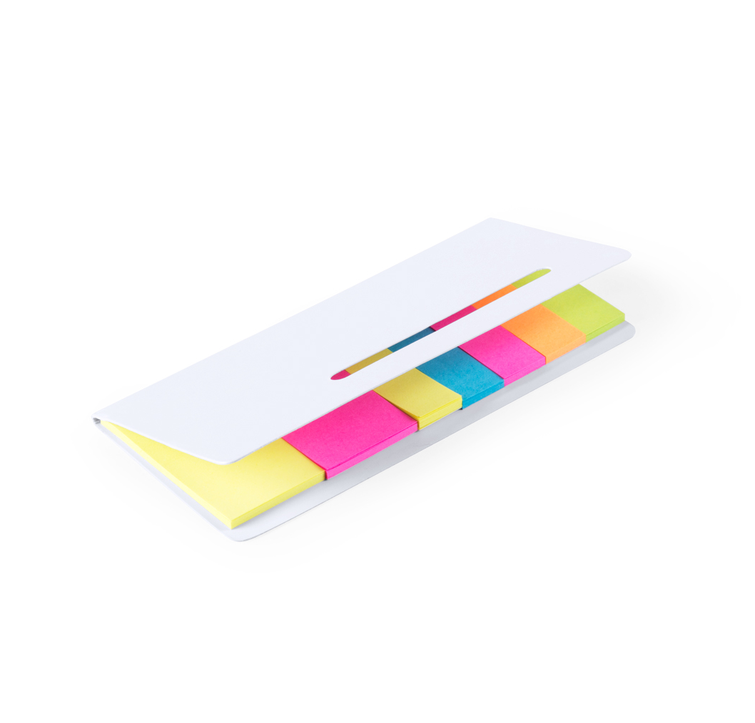 Bloc de notas adhesivas con tapa troquelada de suave tacto acabada en cartón de elegante color blanco.