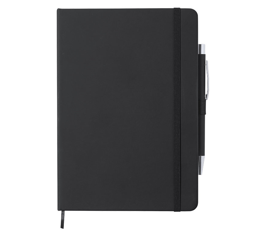 Set de bloc y bolígrafo a juego. Bloc de tapas rígidas con suave tacto acabado en polipiel, incluye soporte para bolígrafo, marcapáginas y cierre elástico, con interior de 100 hojas a una raya